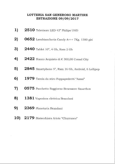 Home > News > NUMERI ESTRATTI LOTTERIA SAN GENEROSO MARTIRE 2017NUMERI ESTRATTI LOTTERIA SAN GENEROSO MARTIRE 201712 Settembre 2017 (clicca sull’immagine per aprire il file)