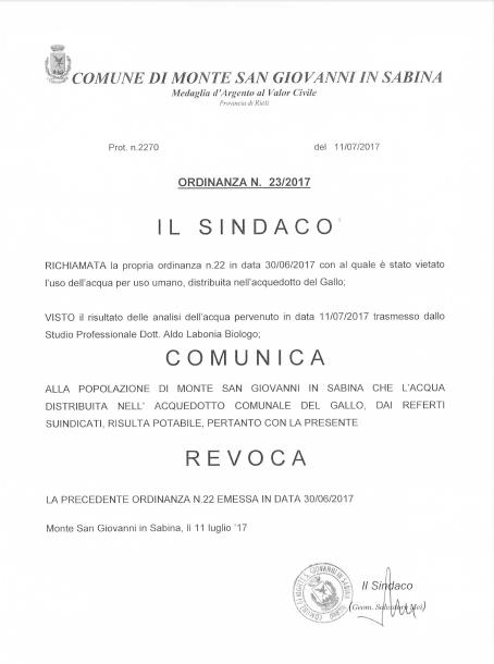 Home > News > ORDINANZA N.23 REVOCA ORDINANZA N.22 RIGUARDANTE LA POTABILITA’ ACQUAORDINANZA N.23 REVOCA ORDINANZA N.22 RIGUARDANTE LA POTABILITA’ ACQUA11 Luglio 2017 (CLICCA SULL’IMMAGINE PER APRIRE IL FILE)